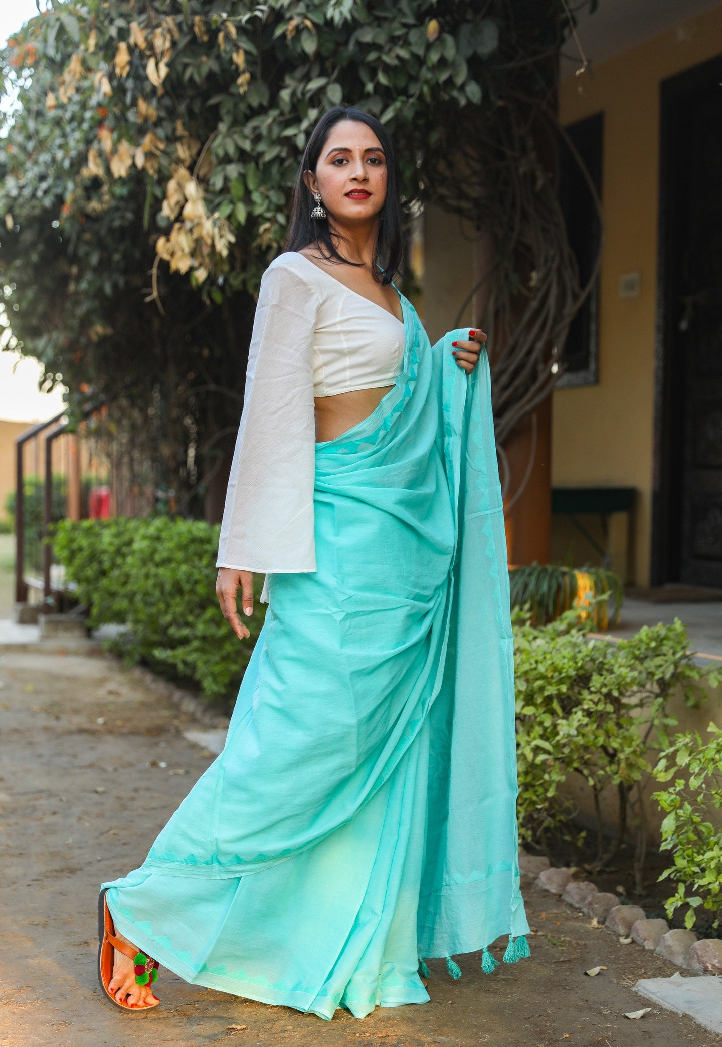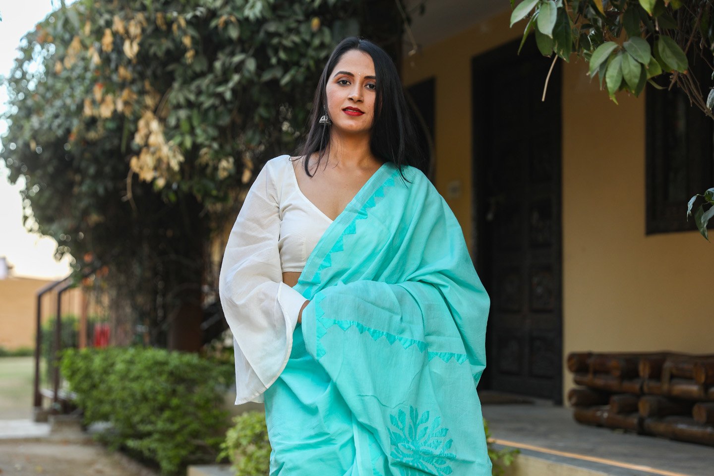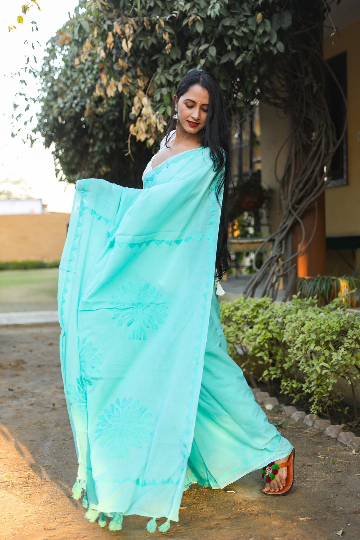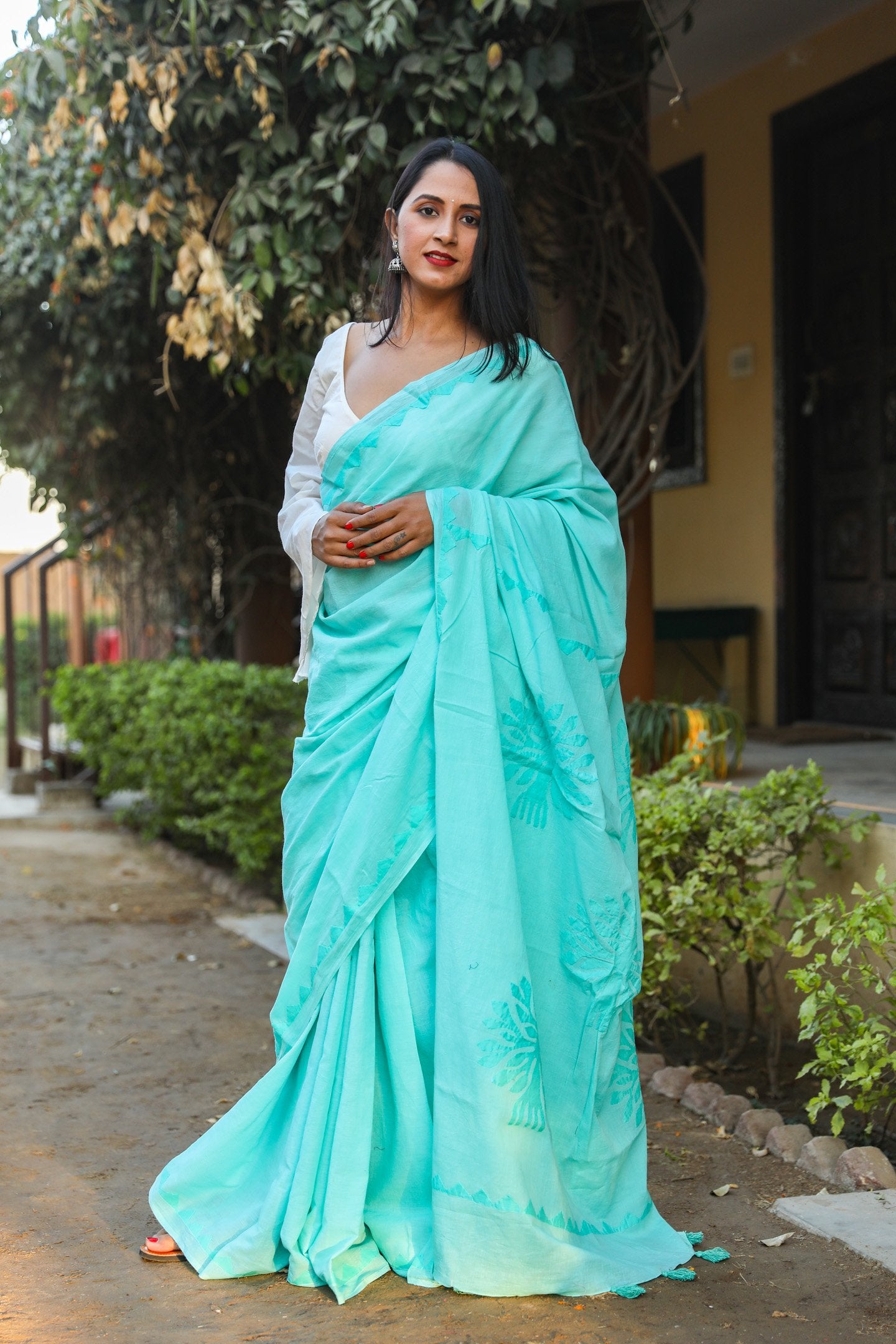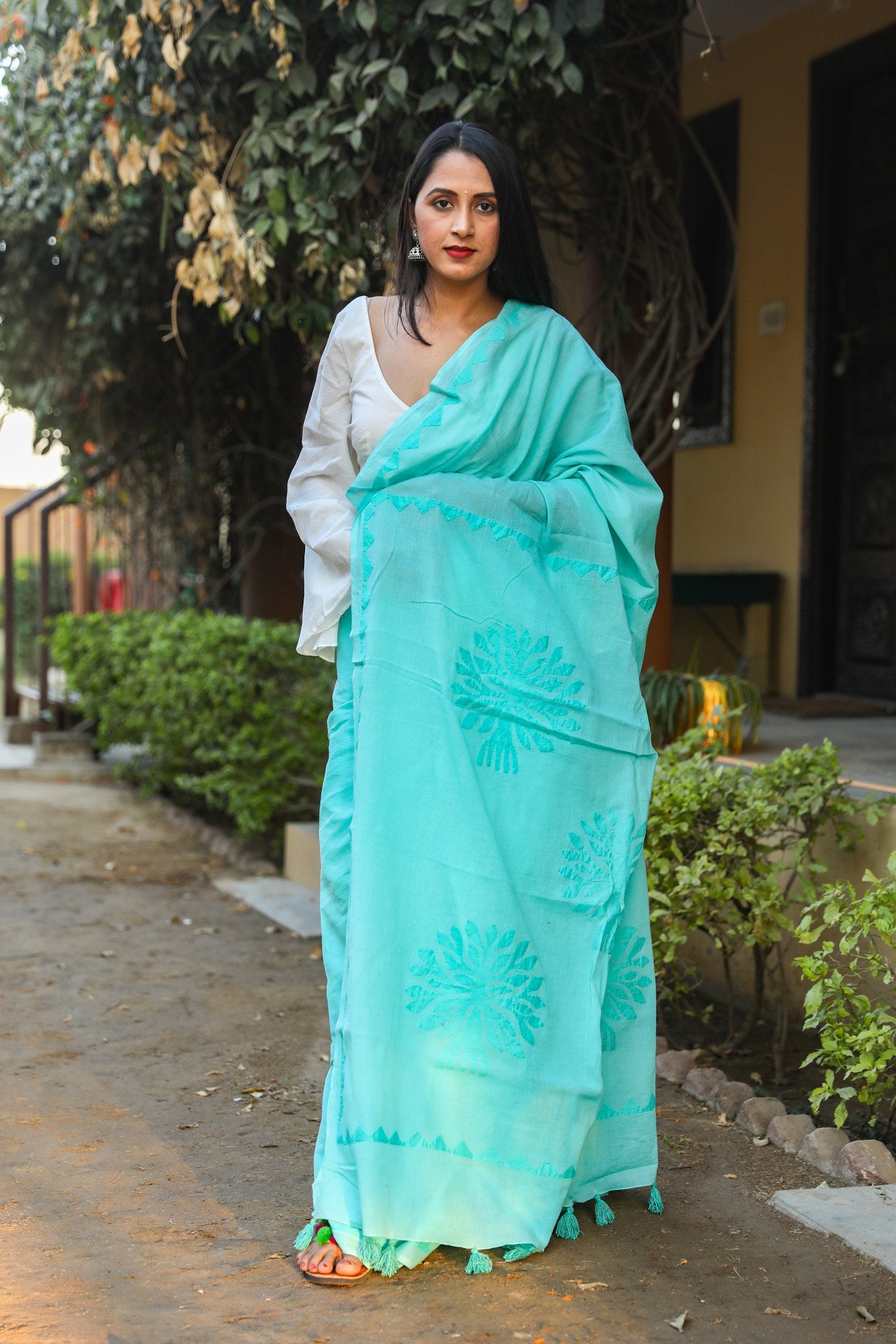 This mul cotton applique work saree with unstitched blouse. This is perfect for summer  session. Block always give a classy look, this can be paired with flat sandals and oxidized jewelry.