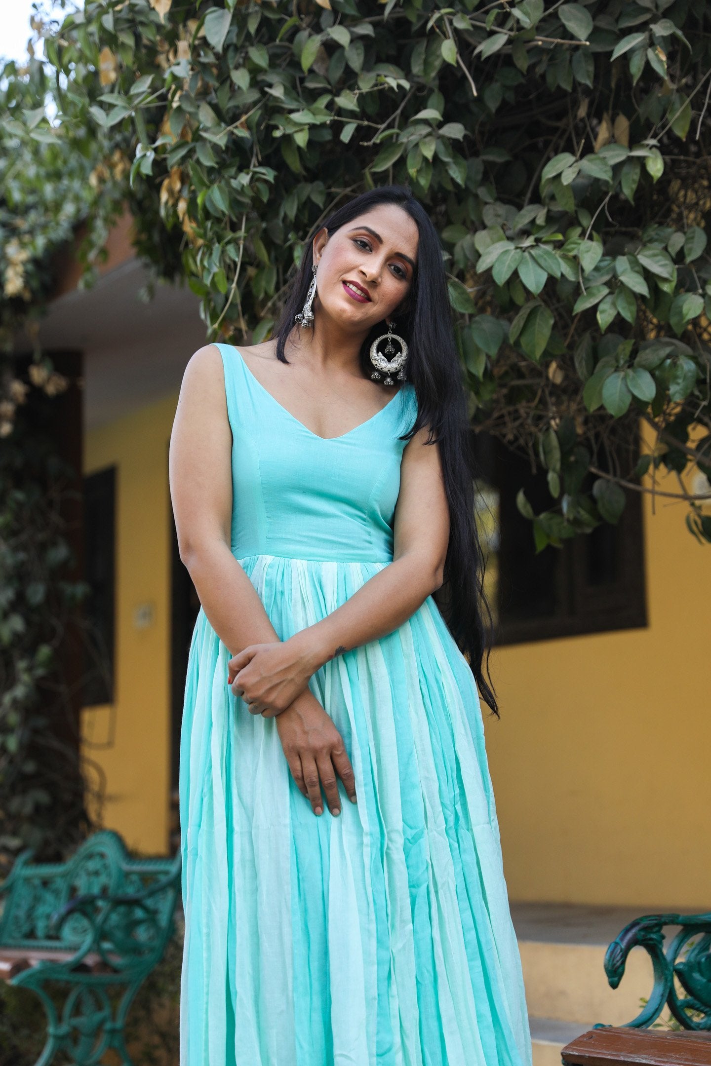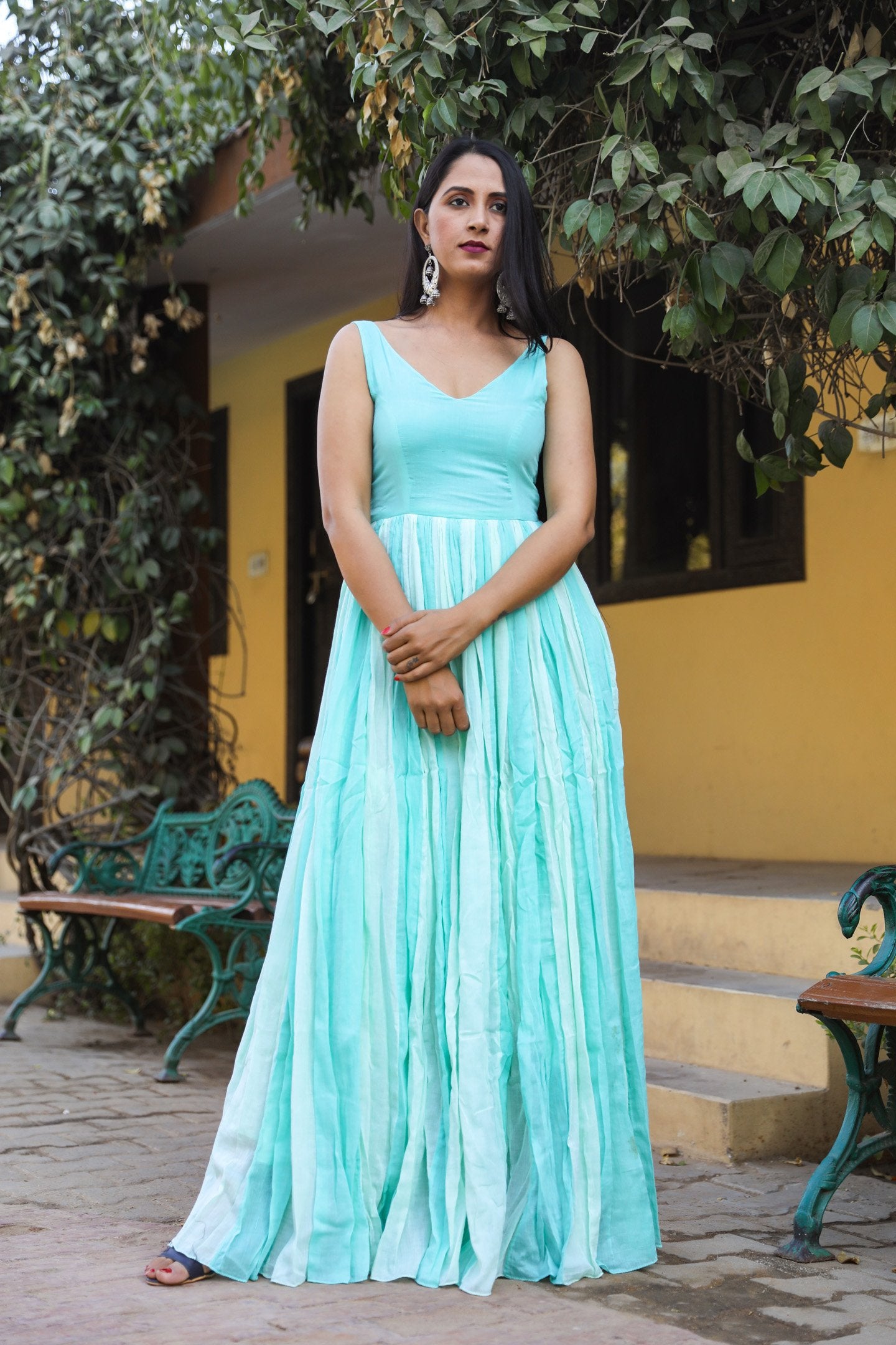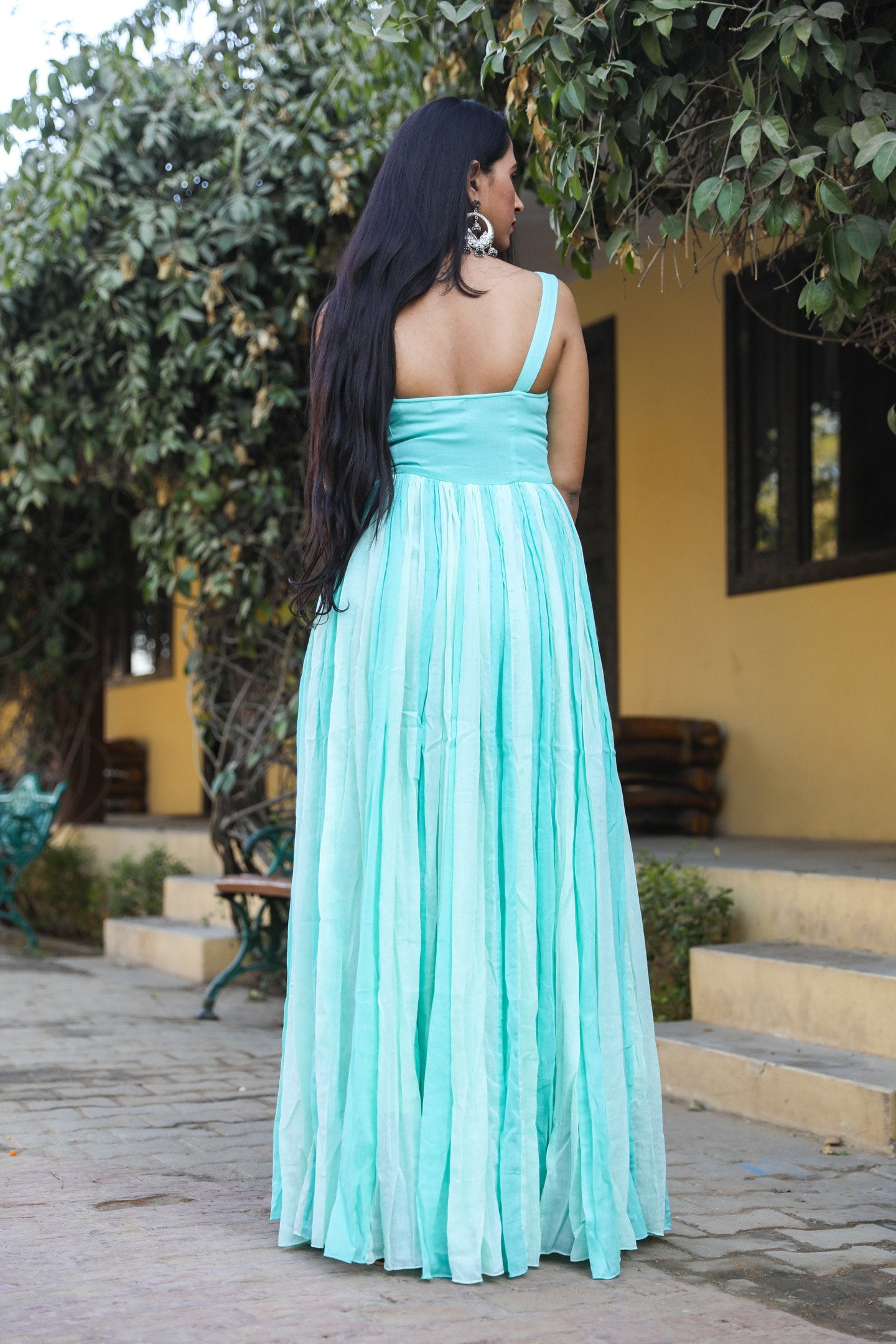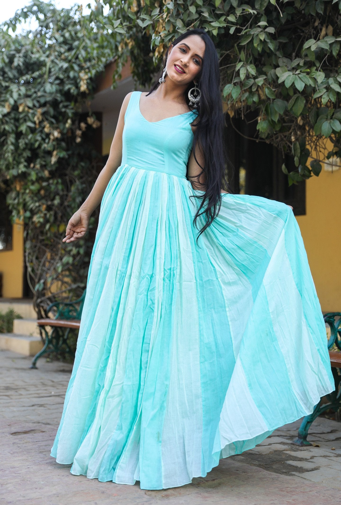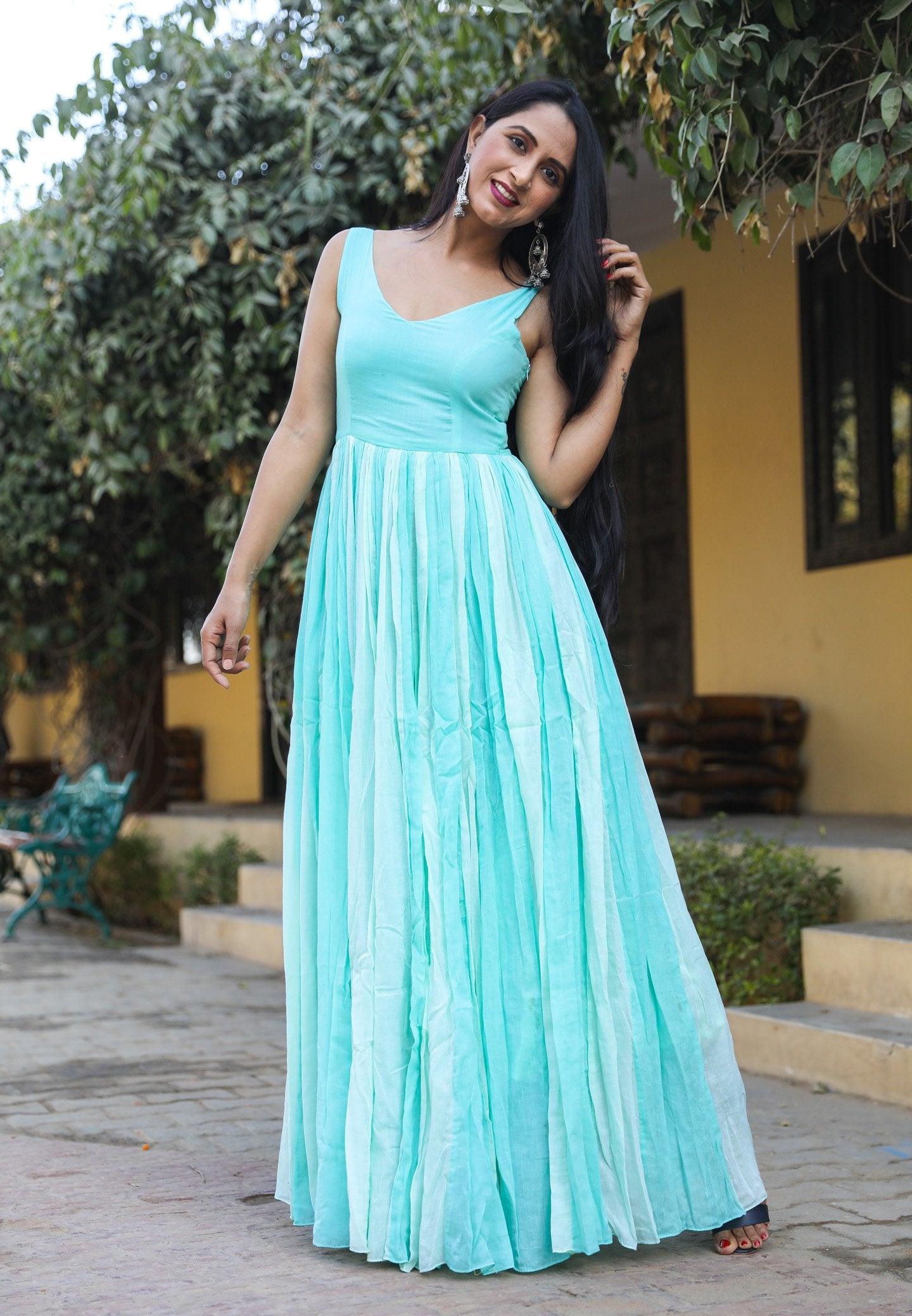 This dress is crafted in mulmul cotton with dual shade kali with zip/chain in side.