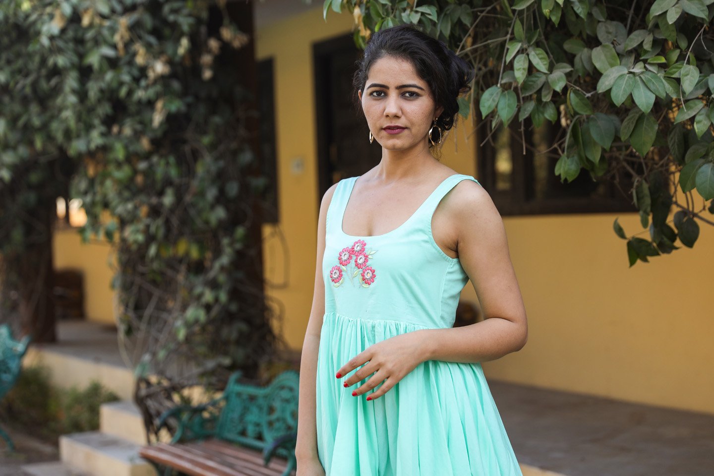 Cotton embroidery  flare short dress, has a U neck,  sleeveless,  embroidery on flared hem. Fabric - Cotton Care - quick and separate wash with soft detergent. Disclaimer - color of the product...