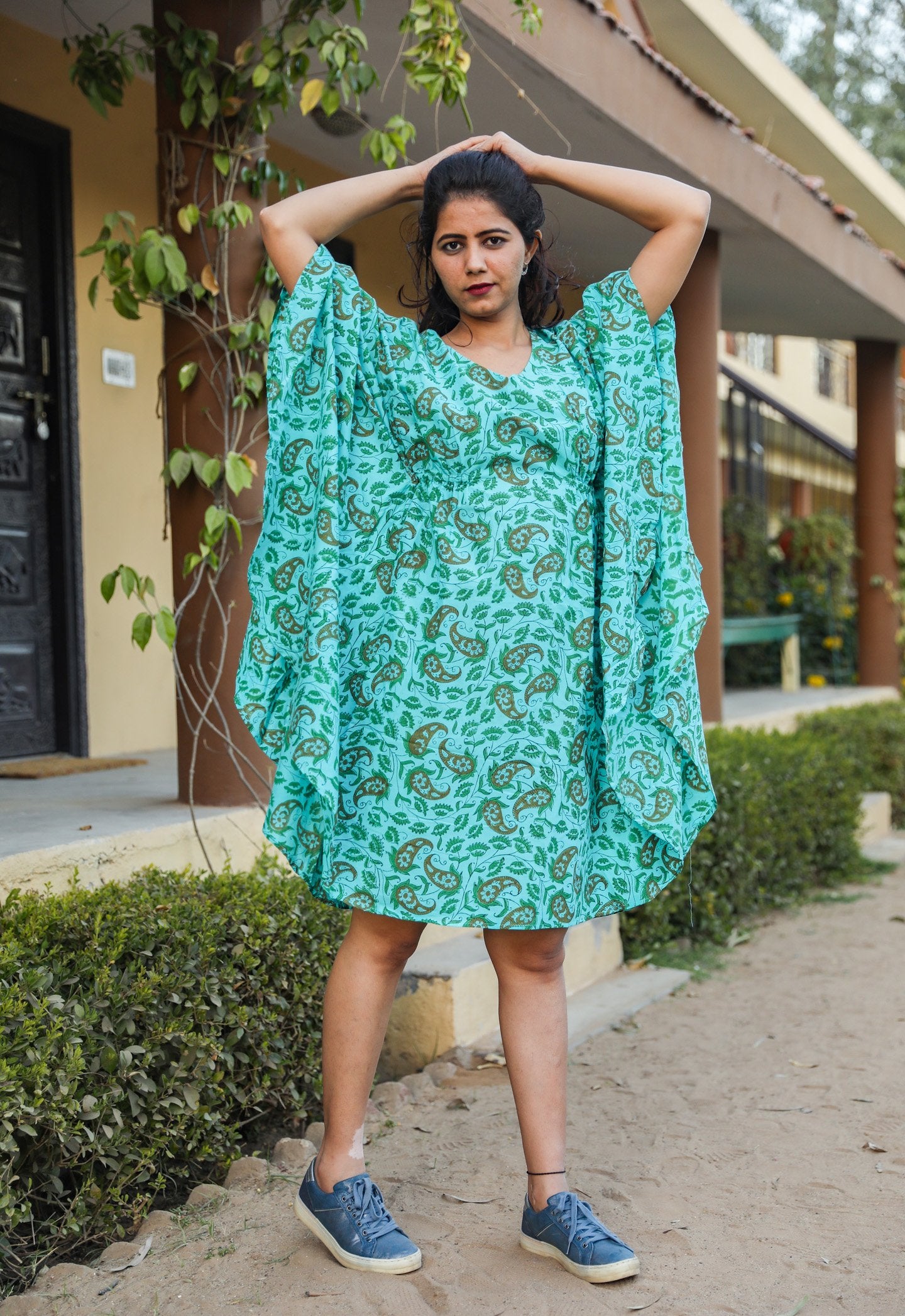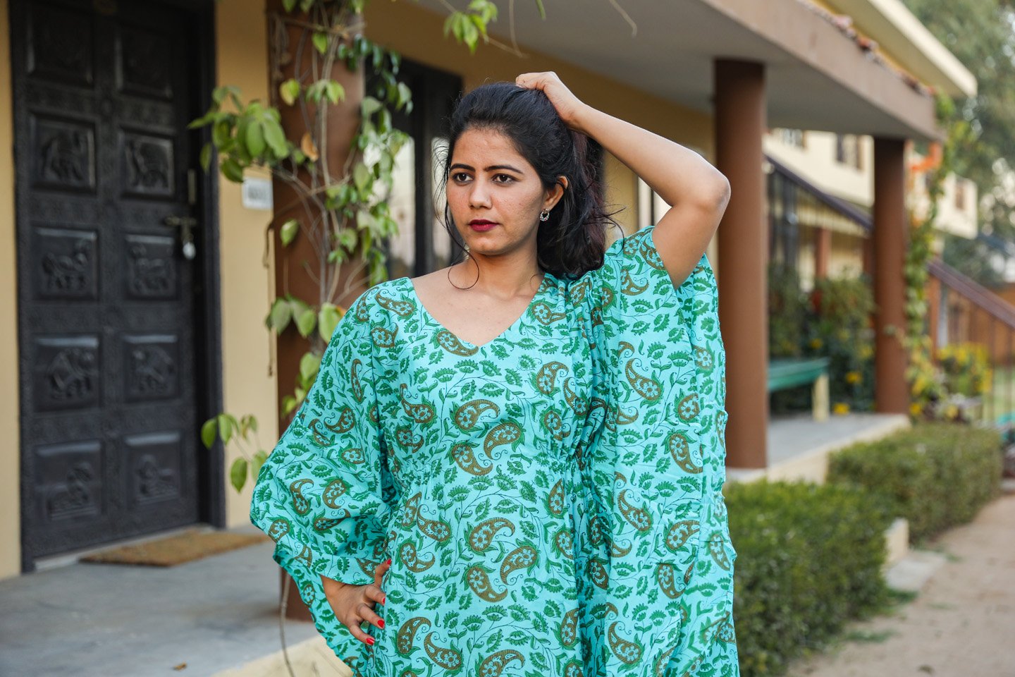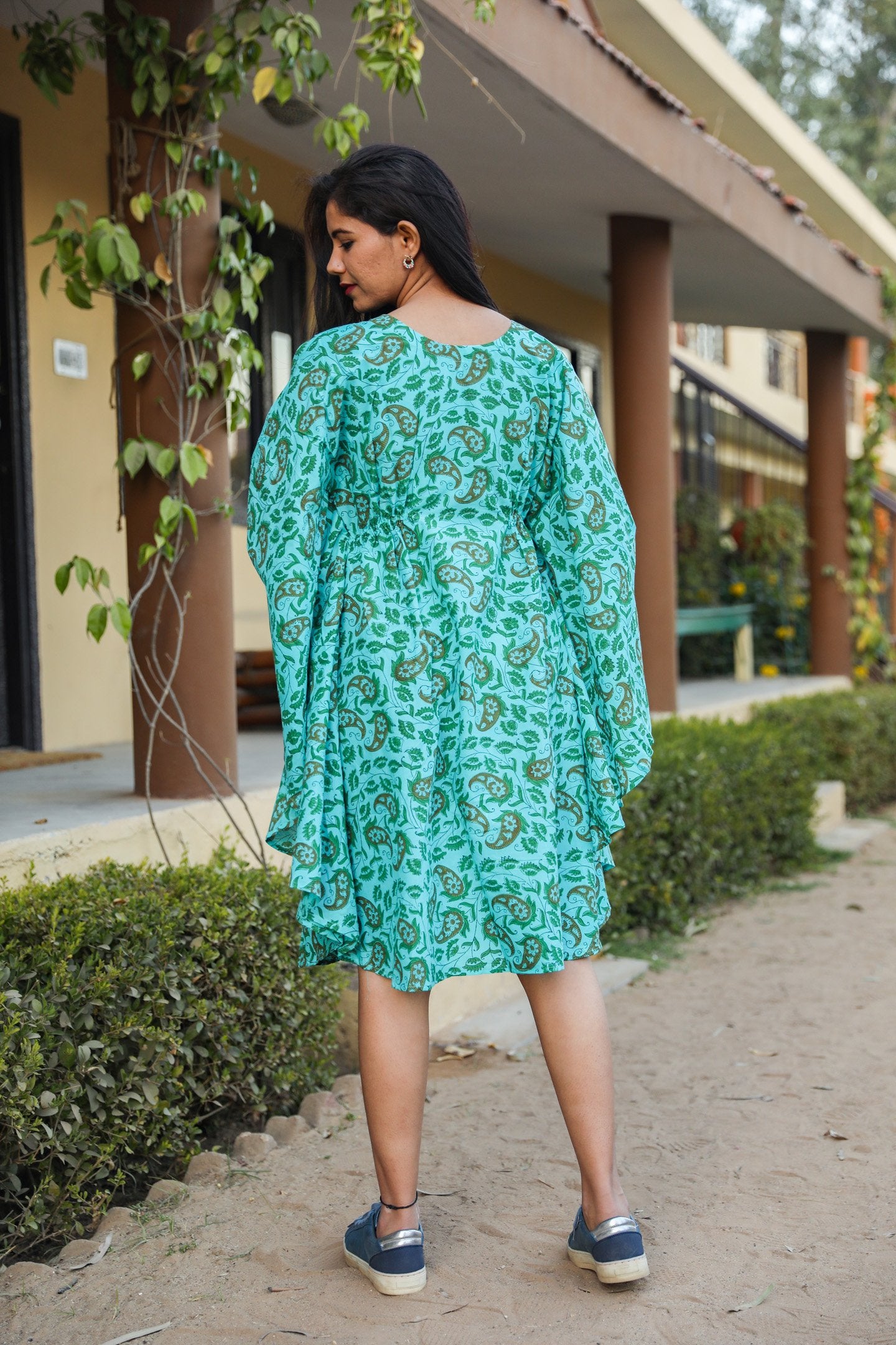 Turquoise Jaal block printed woven ponchhon style and flare dress, has a v neck, half bell sleeves, flared hem.