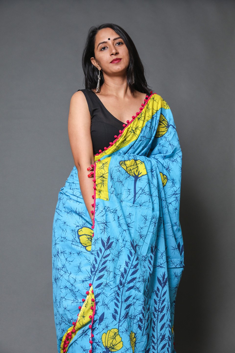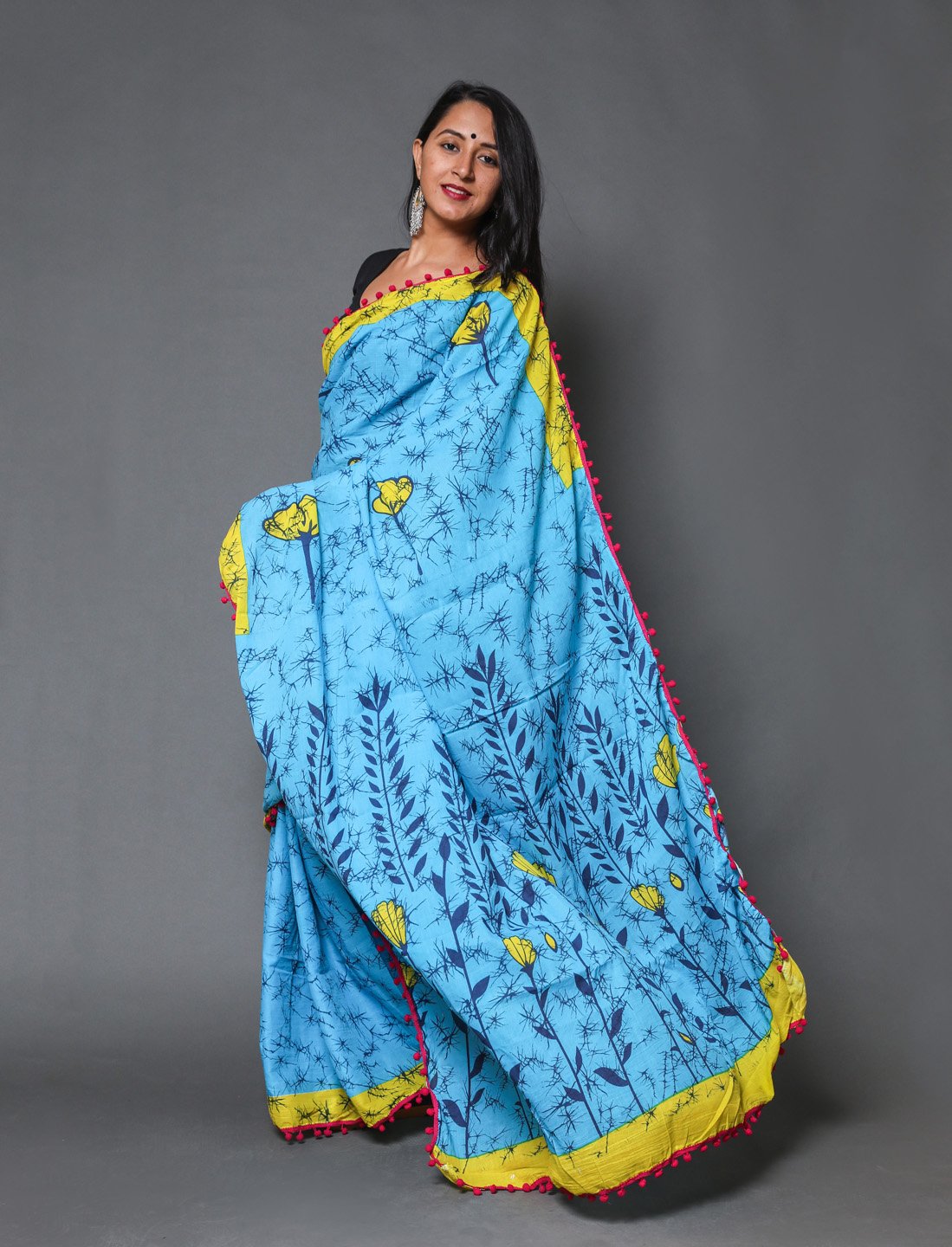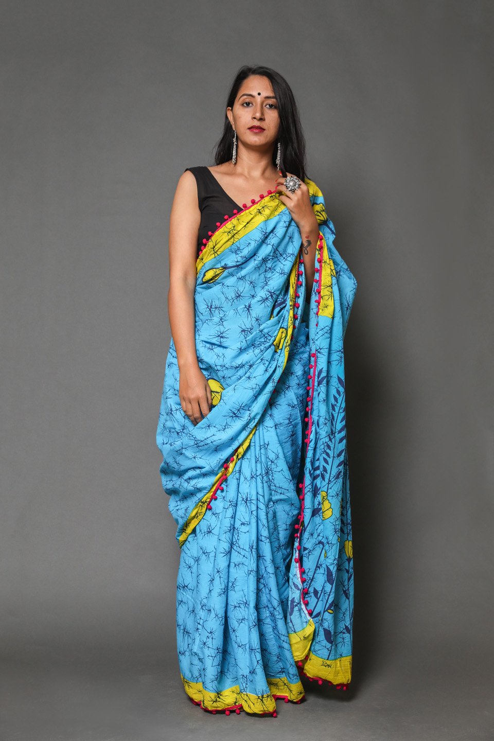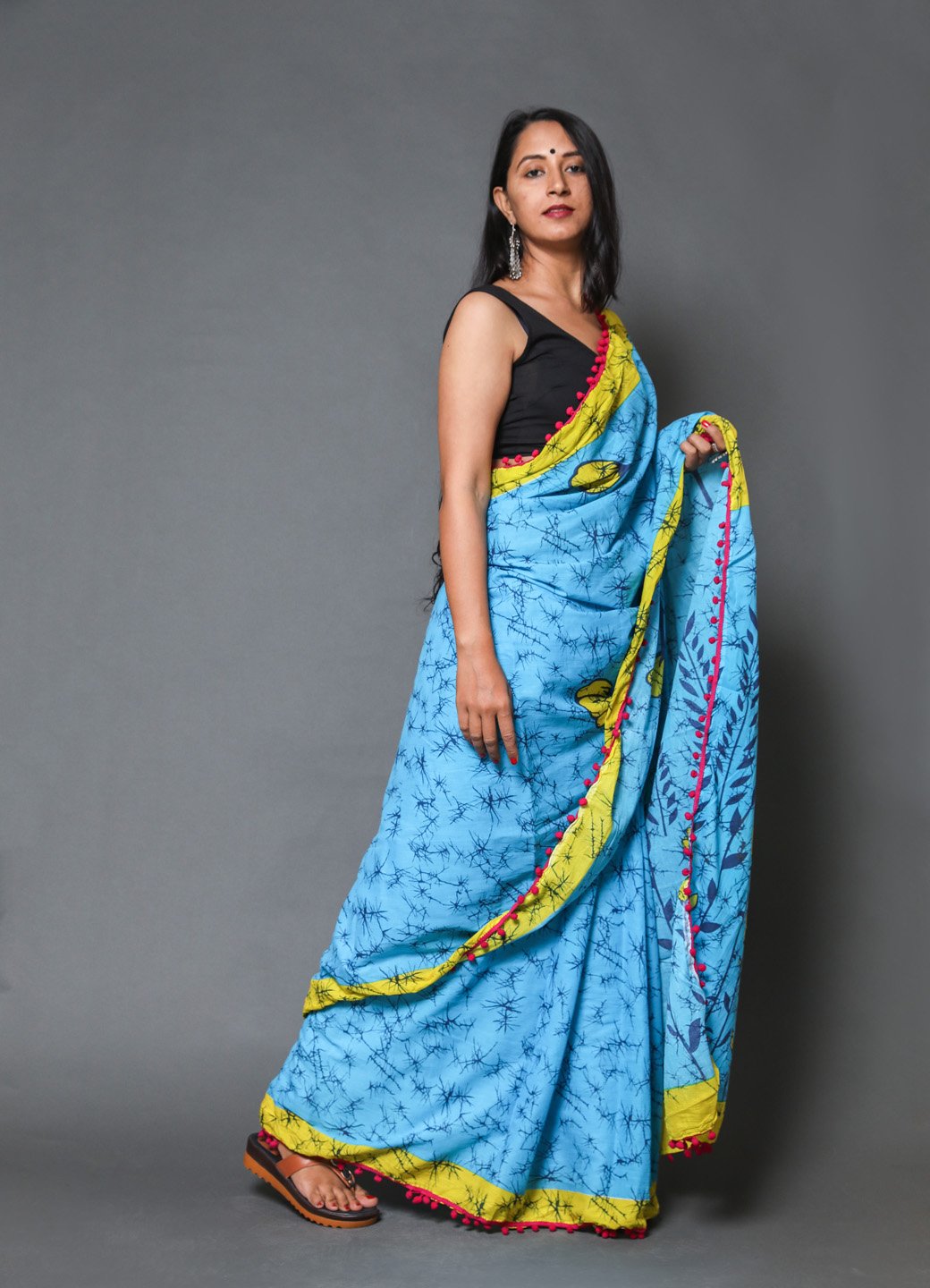 Turquoise & Yellow Batik Print Mul Cotton Saree with Blouse