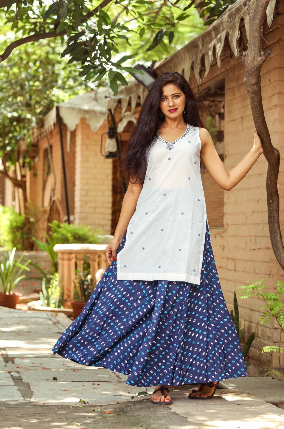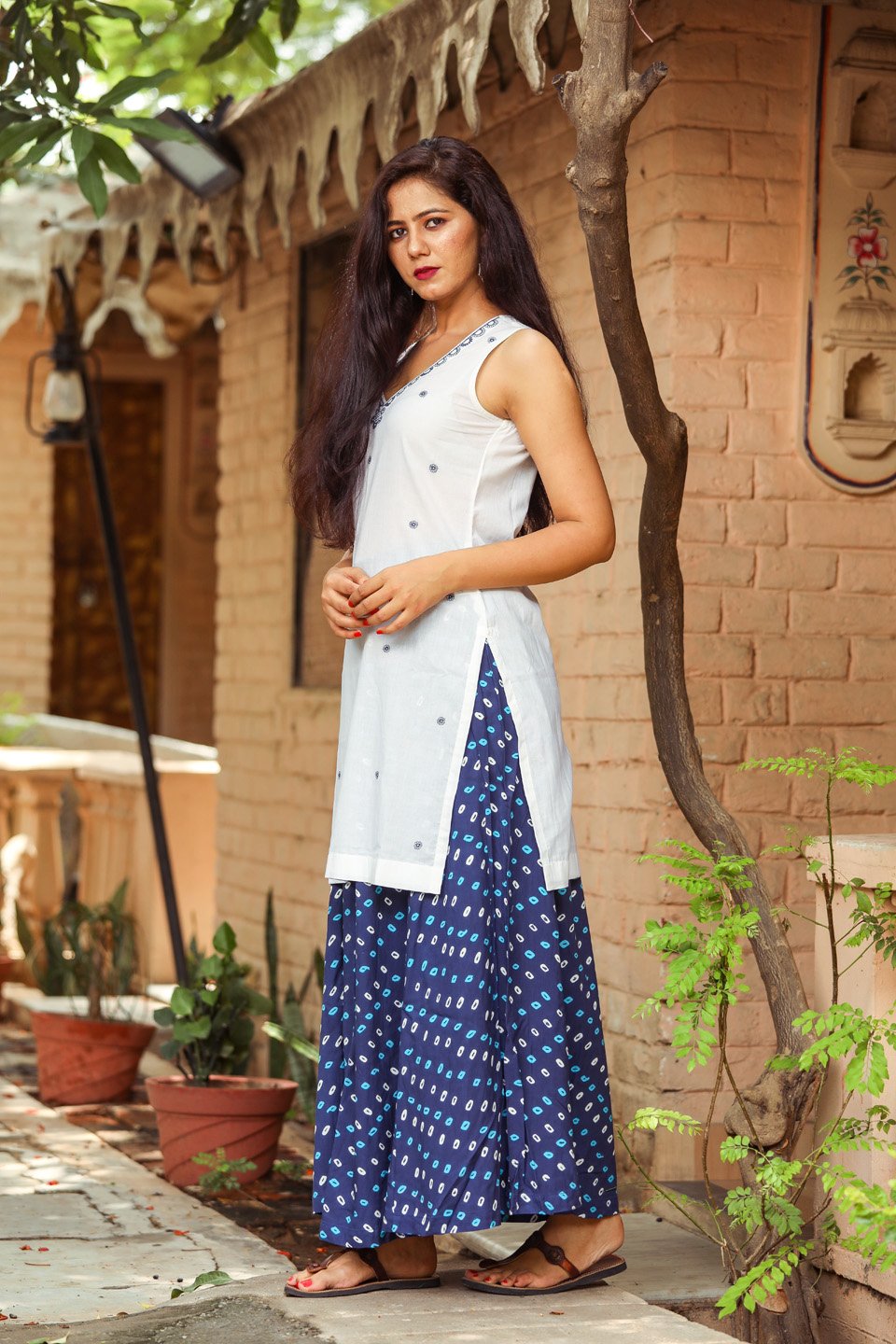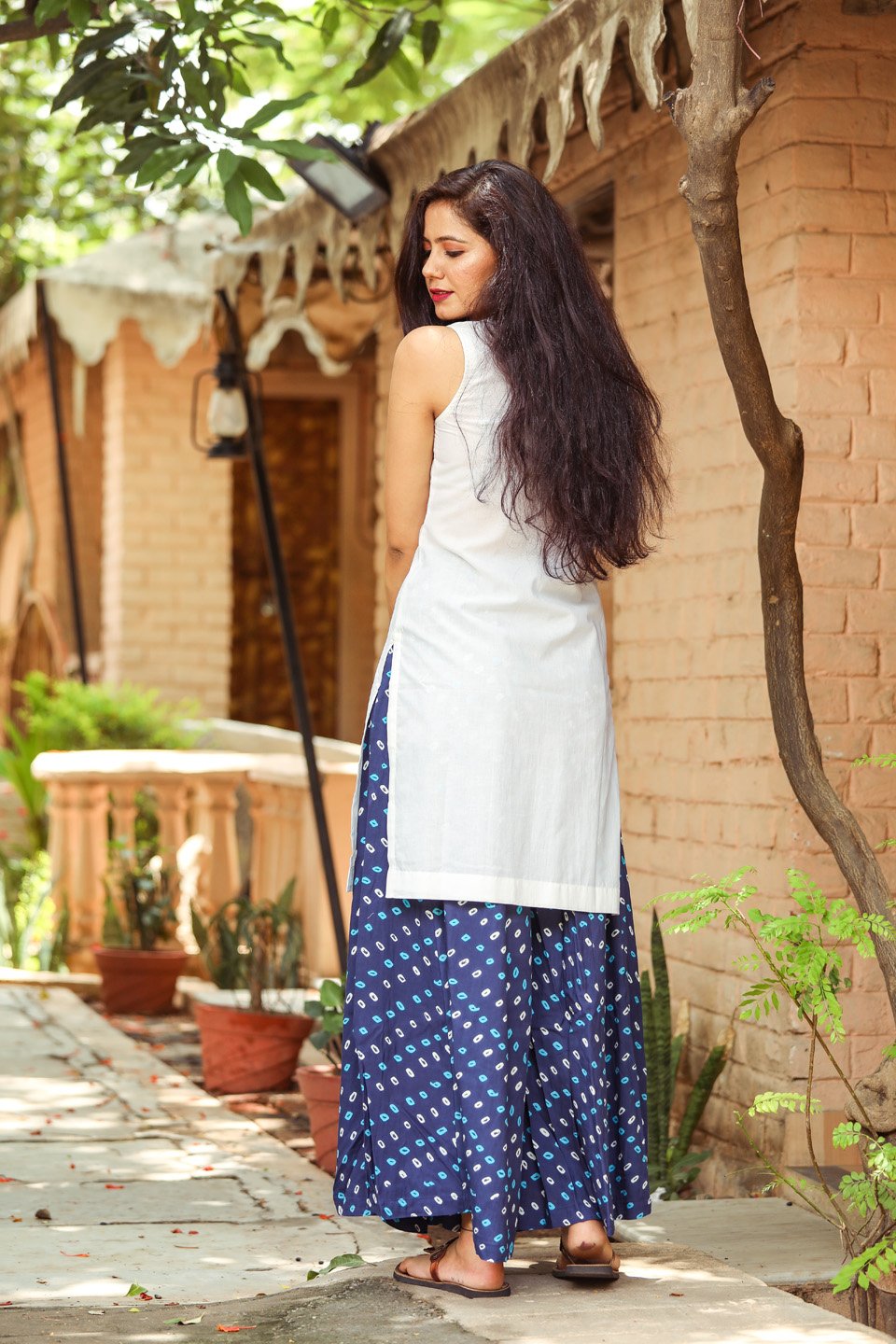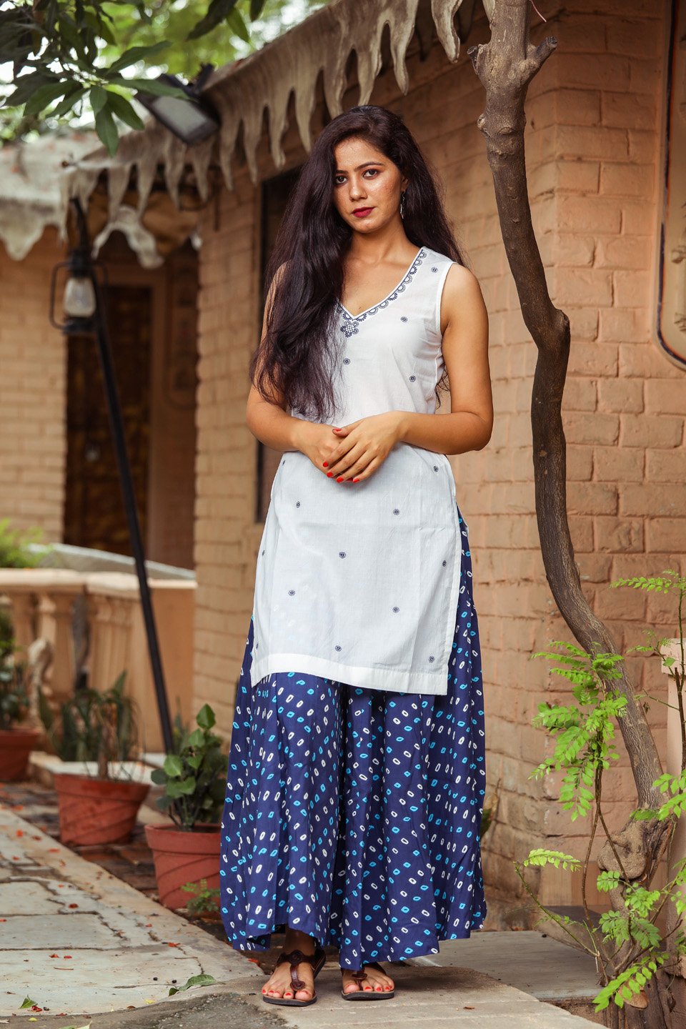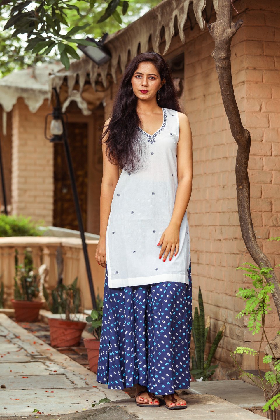 This twin set have straight sleeveless kurta with embroidery on neck  and flare palazzo with tying string. Slay this super comfy twin set at your office, cooperate meeting  or as a casual day out...