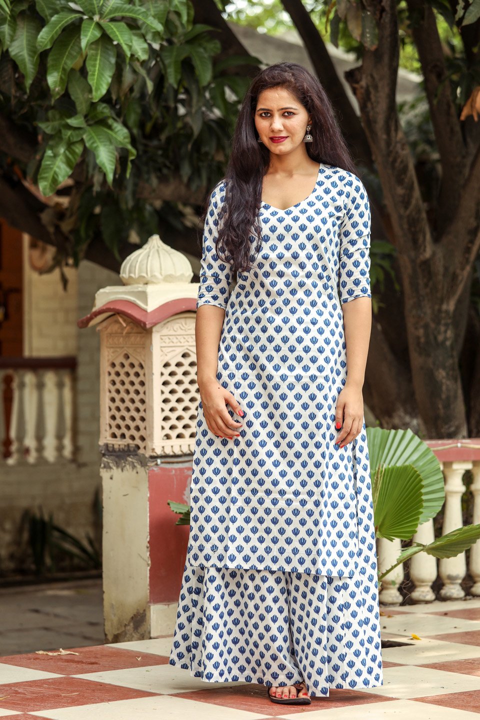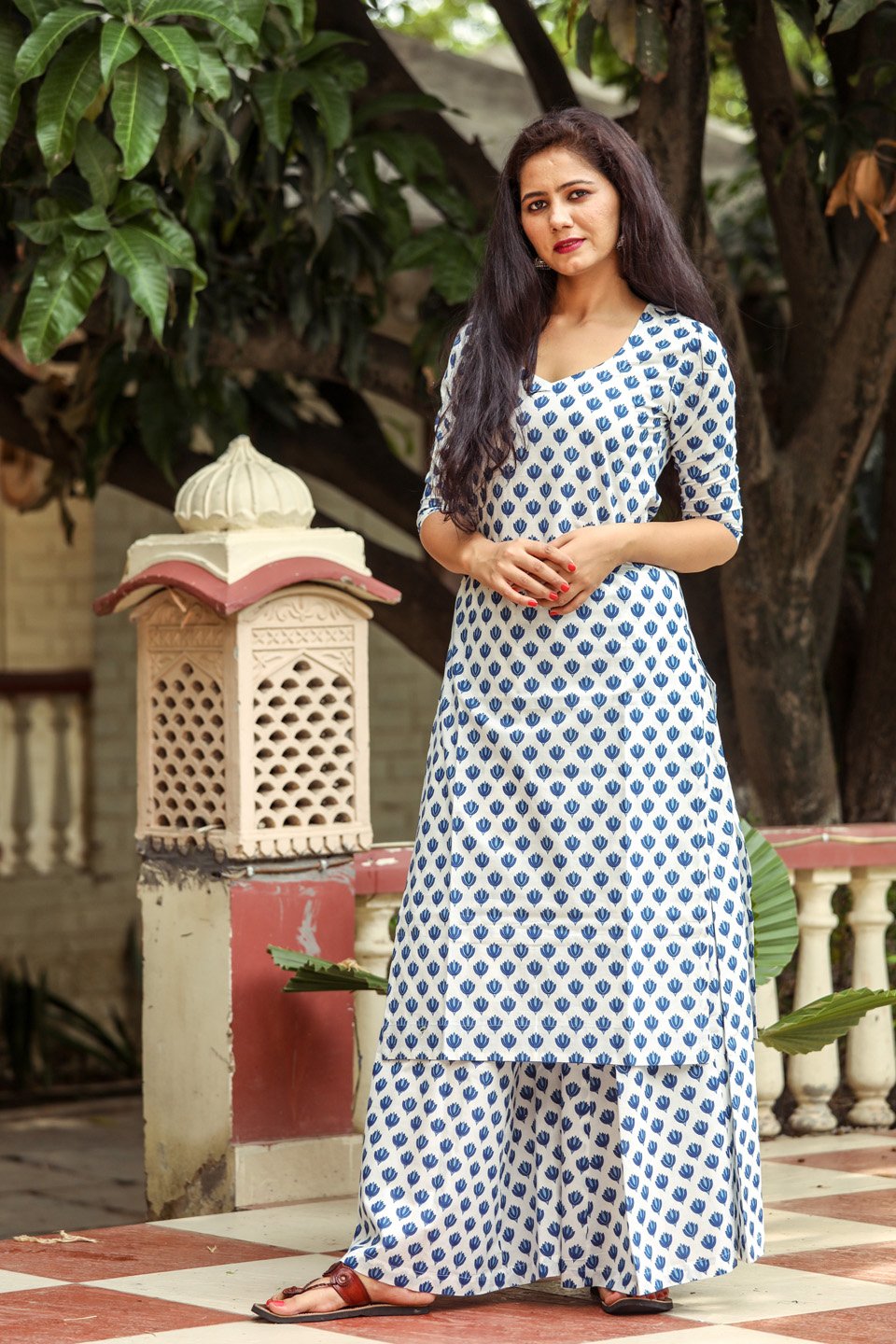 This twin set have straight kurta and flared palazzo in hand block butti print cotton .