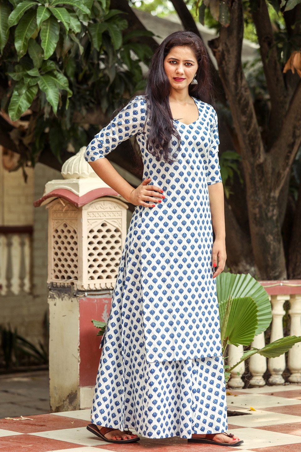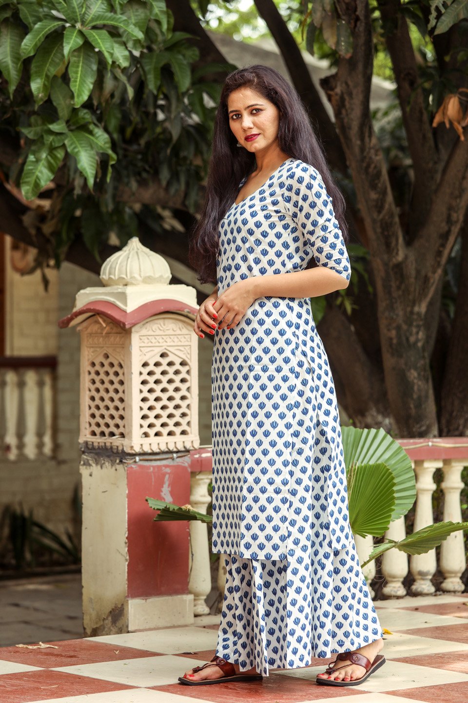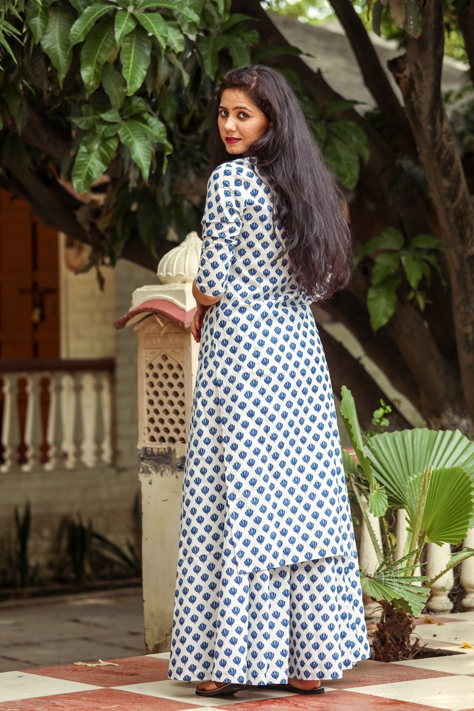 This twin set have straight kurta and flared palazzo in hand block butti print cotton . Slay this super comfy twin set at your office, cooperate meeting  or as a casual day out...