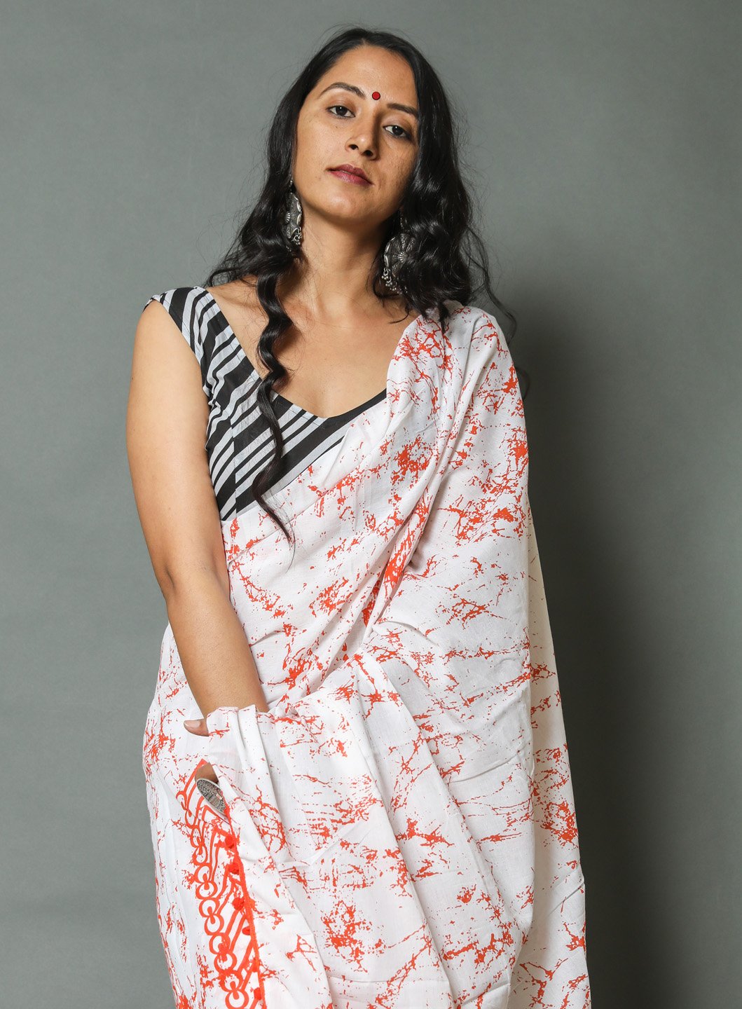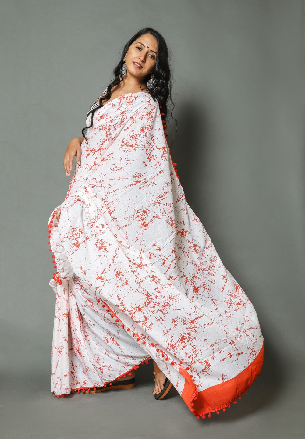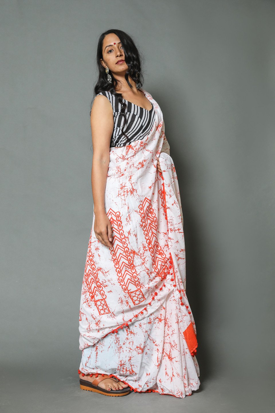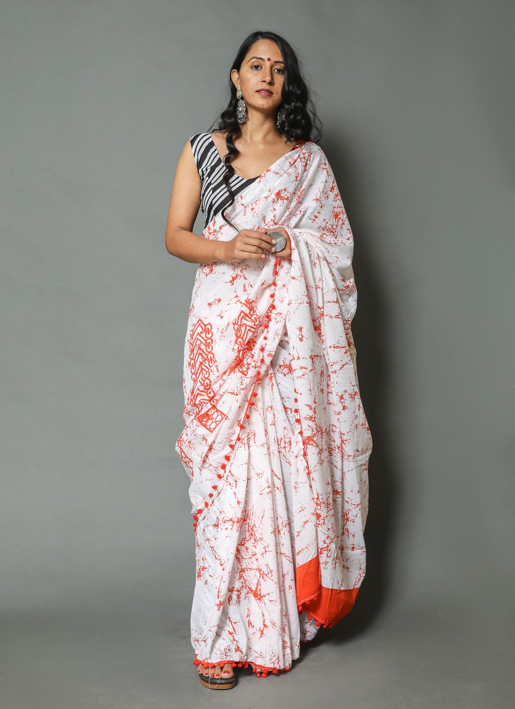 White & Orange Batik Print Mul Cotton Saree with Blouse