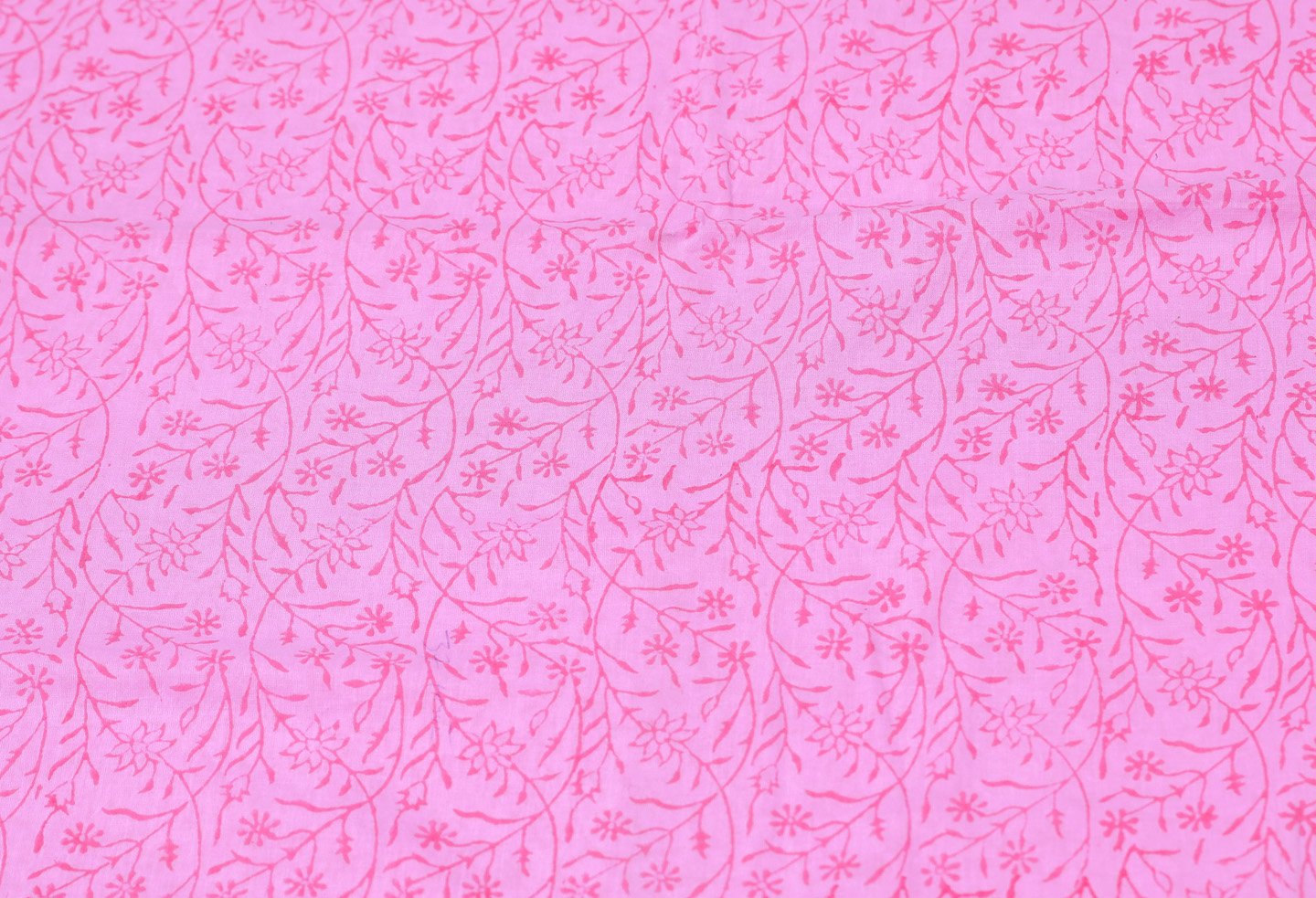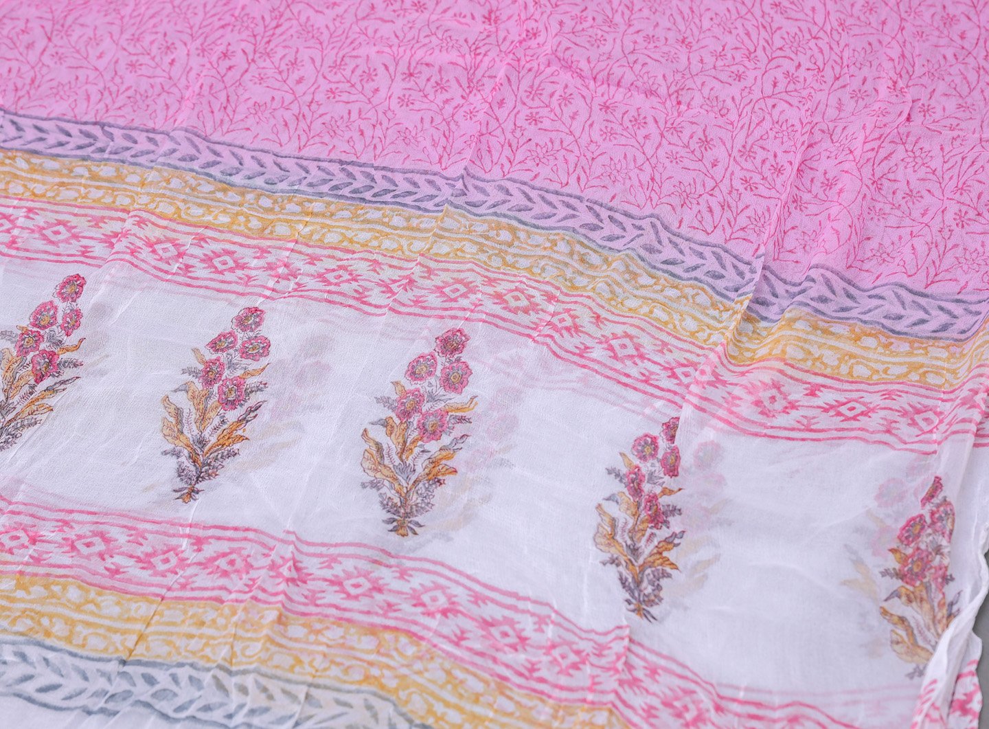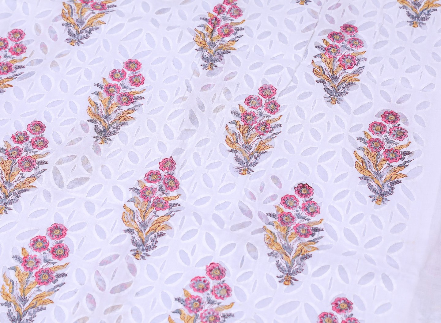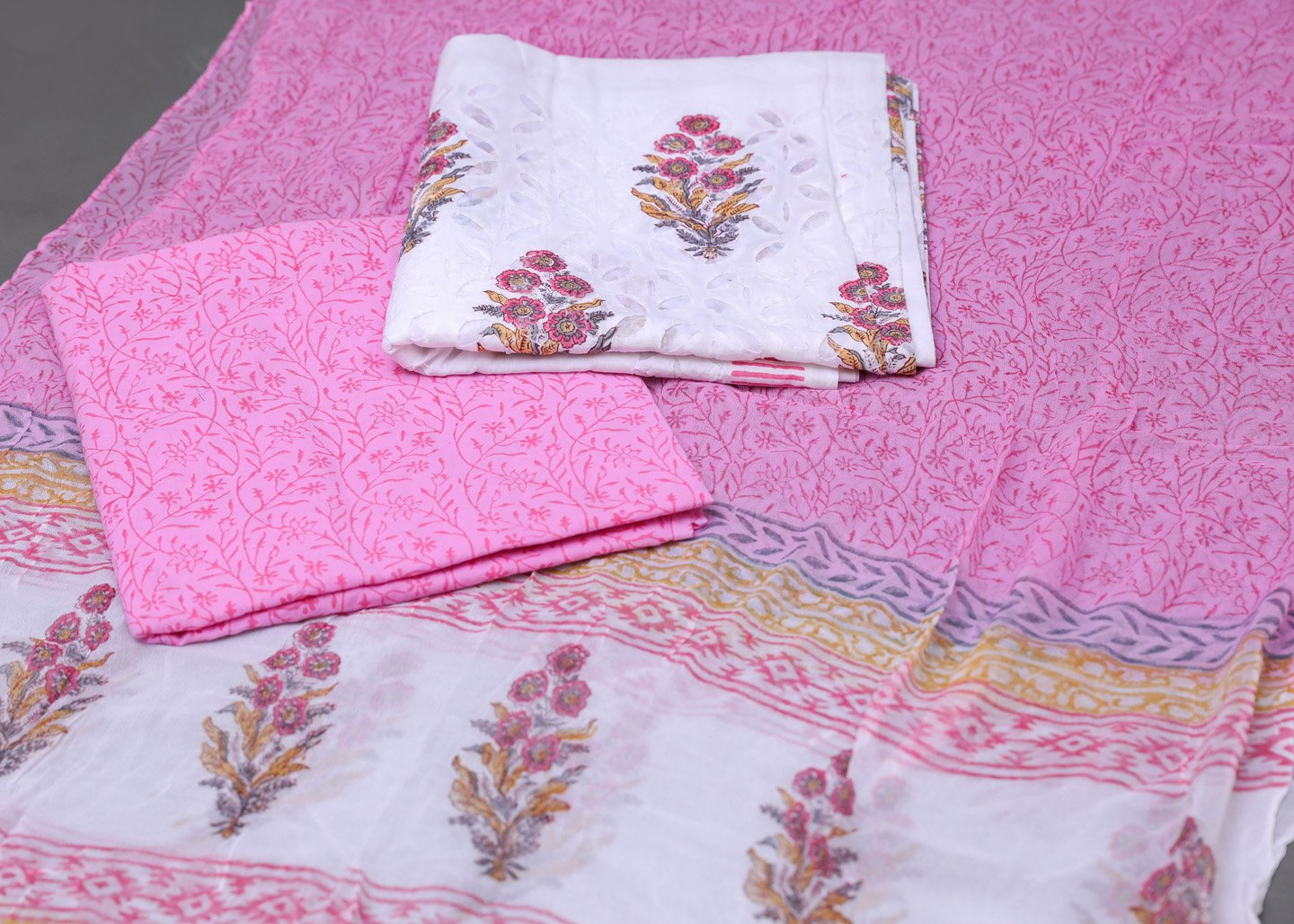 White & Pink Applique Work Block Butta Print Cotton Suit Material