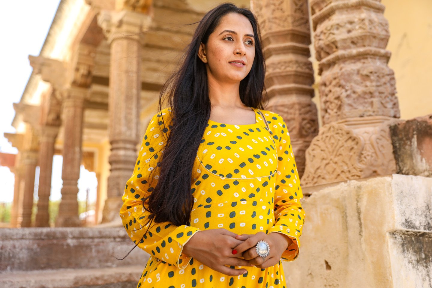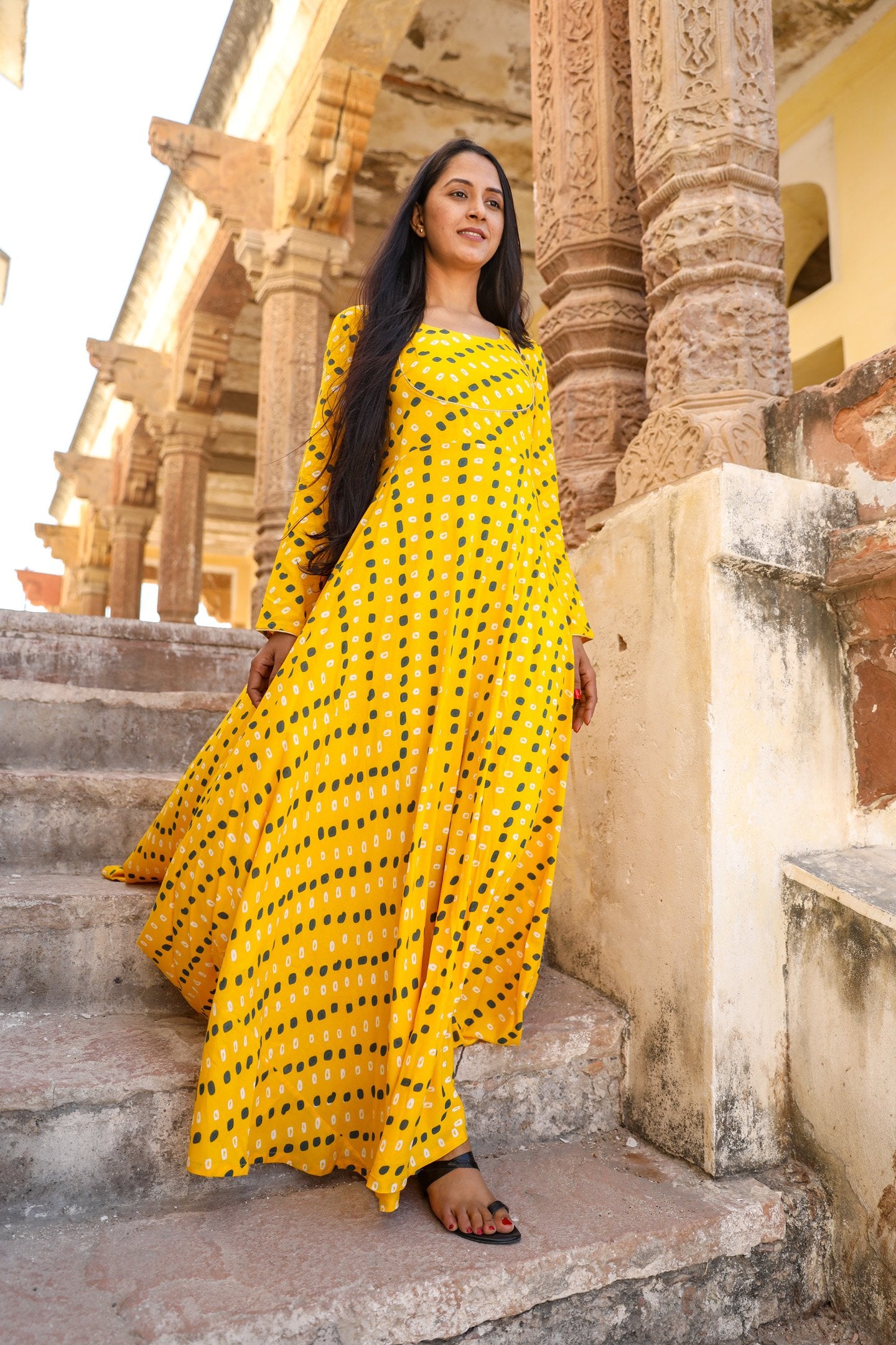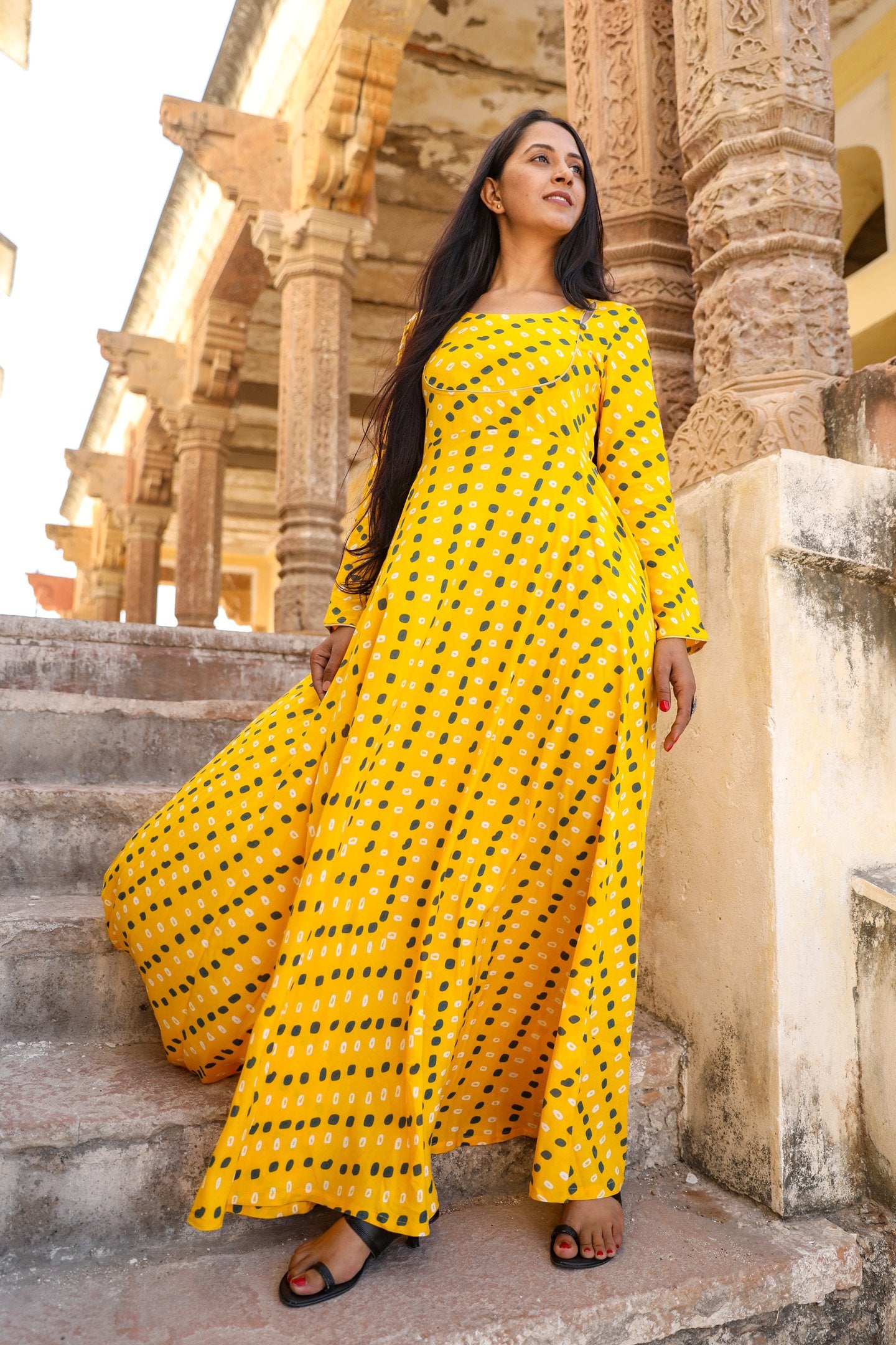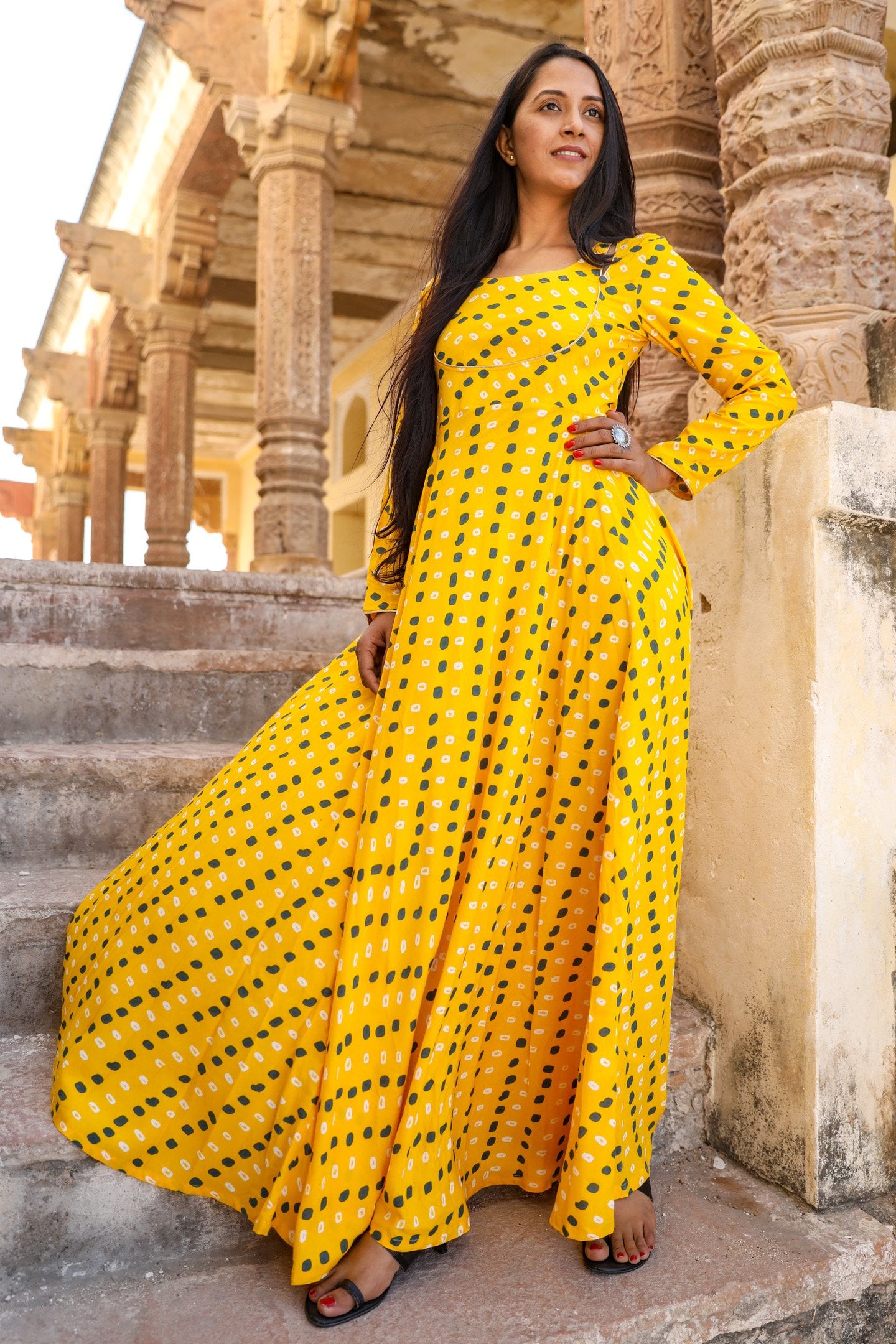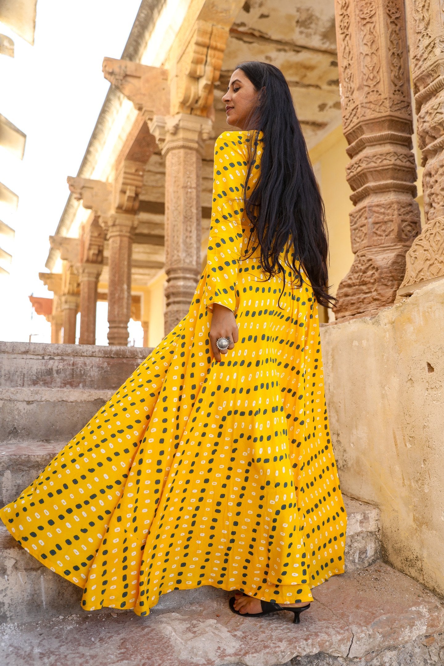 This dress is crafted in bandhaj print rayon with golden piping on neck
