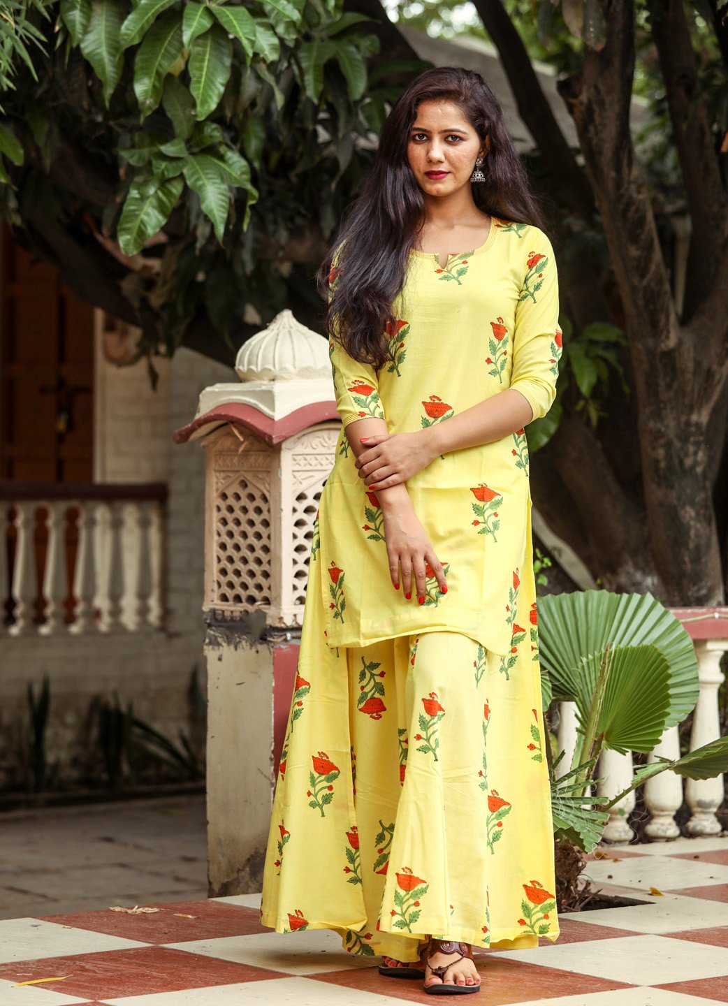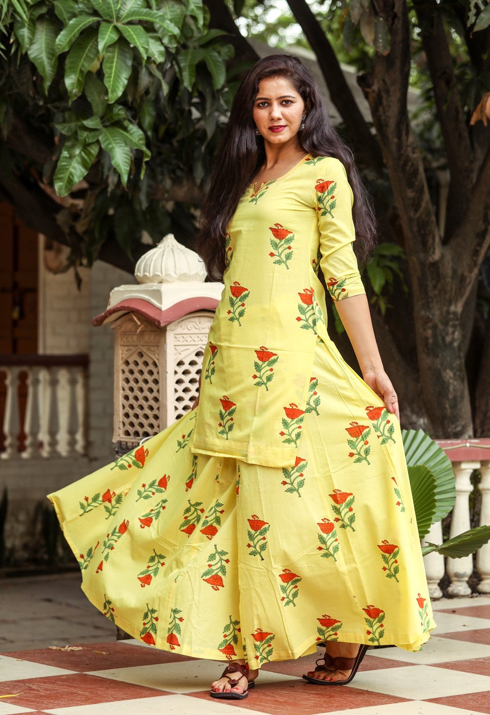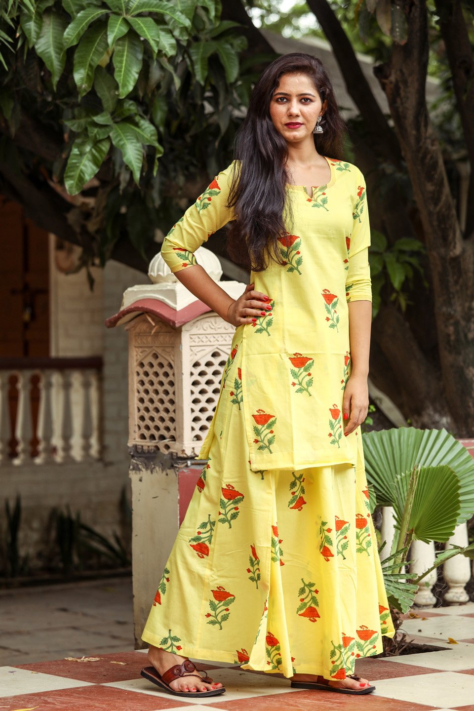 This twin set have straight kurta with anker work on neck, sleeve and flared palazzo in hand block butta print cotton .
